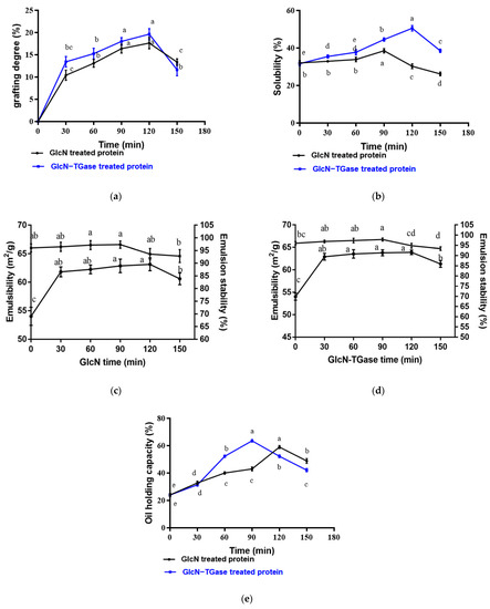 Effect of different treatments on the functional properties of Lentinus edodes protein fraction. Note: (a) grafting degree; (b) solubility; (c) emulsibility and emulsion stability treated with GlcN; (d) emulsibility and emulsion stability treated with GlcN-TGase and (e) oil-holding capacity. For the same index, different lowercase letters indicate significant differences between data (p < 0.05).