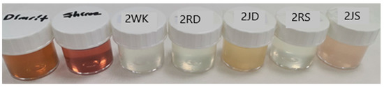 Samples of grape juices and water kefir drinks produced from demineralized whey (dWhey) with 2% lactose content. 2WK = 2% lactose; 2RD = 2% lactose + raisin of Dimrit; 2JD = 2% lactose + grape juice of Dimrit; 2RS = 2% lactose + raisin of Shiraz; 2JS = 2% lactose + grape juice of Shiraz.