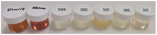 Samples of grape juices and water kefir drinks produced from demineralized whey (dWhey) with 5% lactose content. 5WK = 5% lactose; 5RD = 5% lactose + raisin of Dimrit; 5JD = 5% lactose + grape juice of Dimrit; 5RS = 5% lactose + raisin of Shiraz; 5JS = 5% lactose + grape juice of Shiraz.
