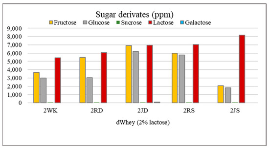 Sugar derivates of water kefir drinks produced from demineralized whey (dWhey) with 2% lactose content and with the addition of Dimrit and Shiraz raisins or grape juice. 2WK = 2% lactose; 2RD = 2% lactose + Dimrit raisin; 2JD = 2% lactose + Dimrit grape juice; 2RS = 2% lactose + Shiraz raisin; 2JS = 2% lactose + Shiraz grape juice.
