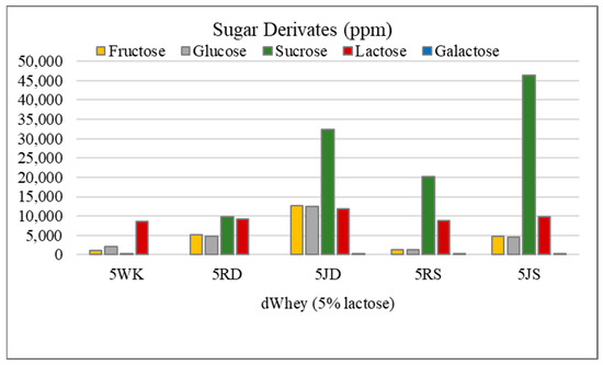 Sugar derivates of water kefir drinks produced from demineralized whey (dWhey) with 5% lactose content and with the addition of Dimrit and Shiraz raisins or grape juice. 5WK = 5% lactose; 5RD = 5% lactose + Dimrit raisin; 5JD = 5% lactose + Dimrit grape juice; 5RS = 5% lactose + Shiraz raisin; 5JS = 5% lactose + Shiraz grape juice.