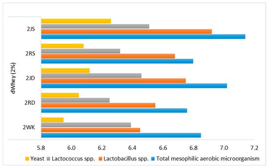 Microbiological characteristics (log cfu/mL) of water kefir drinks produced from demineralized whey (dWhey) with 2% lactose content and with the addition of Dimrit and Shiraz raisins or grape juice. 2WK = 2% lactose; 2RD = 2% lactose + Dimrit raisin; 2JD = 2% lactose + Dimrit grape juice; 2RS = 2% lactose + Shiraz raisin; 2JS = 2% lactose + Shiraz grape juice.