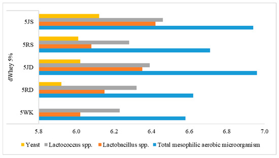 Microbiological characteristics (log cfu/mL) of water kefir drinks produced from demineralized whey (dWhey) with 5% lactose content and with the addition of Dimrit and Shiraz raisins or grape juice. 5WK = 5% lactose; 5RD = 5% lactose + Dimrit raisin; 5JD = 5% lactose + Dimrit grape juice; 5RS = 5% lactose + Shiraz raisin; 5JS = 5% lactose + Shiraz grape juice.