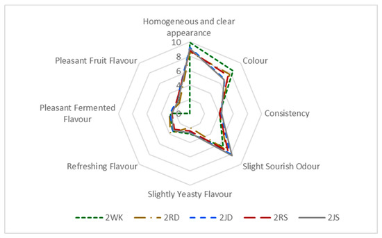 Sensorial evaluation of water kefir drinks produced from demineralized whey (dWhey) with 2% lactose content and with the addition of Dimrit and Shiraz raisins or grape juice. 2WK = 2% lactose; 2RD = 2% lactose + Dimrit raisin; 2JD = 2% lactose + Dimrit grape juice; 2RS = 2% lactose + Shiraz raisin; 2JS = 2% lactose + Shiraz grape juice.