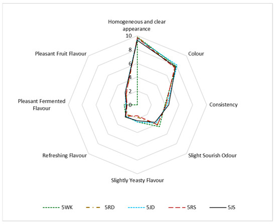 Sensorial evaluation of water kefir drinks produced from demineralized whey (dWhey) with 5% lactose content and with the addition of Dimrit and Shiraz raisins or grape juice. 5WK = 5% lactose; 5RD = 5% lactose + Dimrit raisin; 5JD = 5% lactose + Dimrit grape juice; 5RS = 5% lactose + Shiraz raisin; 5JS = 5% lactose + Shiraz grape juice.
