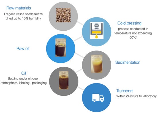 Wild strawberry (Fragaria vesca L.) is a species from the Rosaceae family, widely distributed throughout Europe, Northern America and Northern Asia [1]. Fruits of F. vesca are renowned for their exquisite taste and for the high antioxidant activity linked to the content of phenolics, especially ellagitannins and flavonols [2,3]. The fruits are usually consumed fresh or processed into juice, syrup and jam. Washing and processing fruits generates leftovers liquid containing a range of biomass that can be recovered for biomedical applications. Seeds as part of the residual biomass from processing of wild strawberry fruits contain about 20% fat rich in polyunsaturated fatty acids (PUFA, up to 80% of total fatty acids) with a low ratio of n-6 to n-3 fatty acids (less than 1.5). This renders wild strawberry oil (WSO) an interesting specialty oil; however, to fully appraise its value, analysis of minor oil components coextracted with acylglycerols is required. Yet, literature-derived data on the composition of WSO do not include information on the content of bioactive oil’s micronutrients, such as phytosterols, tocochromanols, carotenoids and phenolic compounds [4]. Our group and other researchers have shown that the micronutrient content of oils recovered from Rosaceae seeds largely determines their bioactivity in both in vitro [5,6] and in vivo systems [7,8].