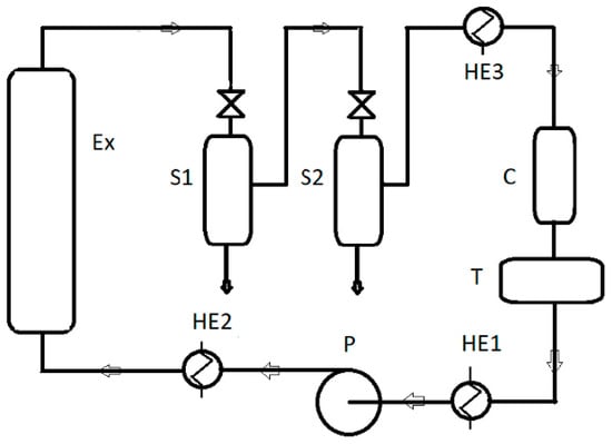 A pilot plant for supercritical CO2 extraction used in the experiment: Ex—extractor; S1, S2—separators; C—condenser; T—liquid CO2 tank; P—pump; HE1, HE2, HE3—heat exchangers.