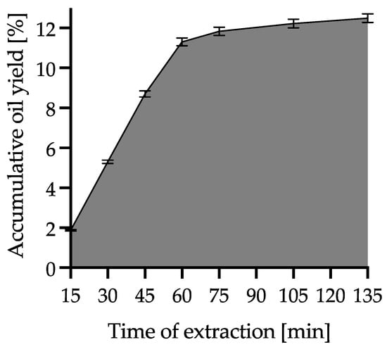 During extraction with supercritical carbon dioxide, WSO was collected at different time intervals (first every 15 min: at 15, 30, 45, 60, 75 min, then every 30 min: at 105 and 135 min). As a result, 7 fractions were obtained, which were denoted SCO215, SCO230, SCO245, SCO260, SCO275, SCO2105 and SCO2135, respectively. This process was repeated three times. The practical criterion for the completion of the process was a cumulative increase in the mass of the extract below 0.3%. The yield increment during the SCO2E is presented in Figure 3. The extracts collected were subjected to quality analysis, including fatty acid composition, antiradical capacity and quality parameters. Fractions that had the best quality parameters were subjected to minor compounds analysis and accelerated oxidative stability tests. For this purpose, individual samples at each time point were carefully mixed and prepared for analysis in accordance with the methodology used. Oil samples were stored at −20 °C until analysis.