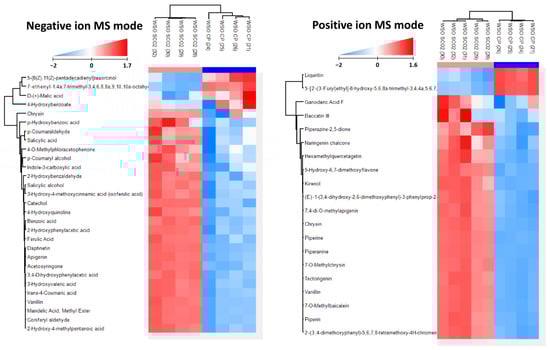 Hierarchical clustering analysis showing the differences in amounts of given compounds. Clustering was performed on both samples and compounds. Results show that samples clusters in proper groups, and compound clustering groups compound with similar profiles of polyphenol fraction of CP and SCO215 WSOs. Similar analyses were performed on ESI/MS-negative and -positive mode data. In both cases, two main clusters of compounds are found with opposite concentration profiles.