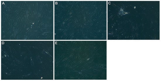 Normal human dermal fibroblast cell line, NHDF (CC-2511), was purchased from Lonza (Basel, Switzerland). Cells were grown in culture flasks (T-180, TPP, Sigma-Aldrich, Saint Louis, MO, USA) in Dulbecco’s Modified Eagle Medium without phenol red (DMEM; no phenol red; Gibco, Thermo Fisher Scientific, Waltham, MA, USA) supplemented with 2 mM L-glutamine (Gibco, Thermo Fisher Scientific, Waltham, MA, USA). The cell culture medium was supplemented with 10% fetal bovine serum (FBS; Gibco, Thermo Fisher Scientific, Waltham, MA, USA) and 1% antibiotic solution containing 10,000 penicillin units/mL, 10 mg/mL streptomycin and 25 µg/mL amphotericin B (Sigma-Aldrich, Saint Louis, MO, USA). Every three days, the cell culture was assessed under a light microscope (EVOS FL, Thermo Fisher Scientific, Waltham, MA, USA), and if the confluence was less than 80%, the medium was renewed; otherwise, the cell culture was passaged using TrypLE solution (Gibco, Thermo Fisher Scientific, Waltham, MA, USA). Cells were grown under standard culture conditions at 37 °C in an incubator in 95% humidified air containing 5% CO2. To reduce the number of cells or to seed on multi-well test plates, the culture medium from the culture flask was removed, the culture medium was washed with TrypLE to inactivate FBS, and then fresh TrypLE was added for 2–3 min at 37 °C to detach the cells from the surface of the culture flasks. After this time, fresh medium was added to inactivate the TrypLE. The suspension was collected and centrifuged to remove the TrypLE solution. After suspending the cell culture in fresh medium, the suspended cells were collected. A 25 µL sample of the cell suspension was stained with the same volume of 0.4% trypan blue solution and counted in a Brucker chamber under an EVOS FL microscope.