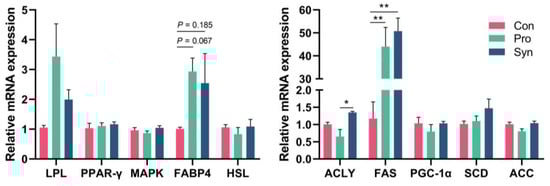 The effect of probiotics and synbiotics on mRNA expression of longissimus thoracis lipid synthesis-related genes (* p < 0.05, ** p < 0.01).