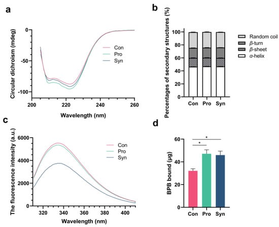 Circular dichroism (CD) is an important tool for assessing the secondary structure of proteins and is widely used. As shown in Figure 2a, it was observed that two negative peaks appeared at approximately 210 nm and 223 nm, which are indicative of the presence of α-helix structure in the protein [37]. Dietary supplementation with probiotics and synbiotics changed the CD spectrum of MP, which implies a change in the secondary structure of MP.