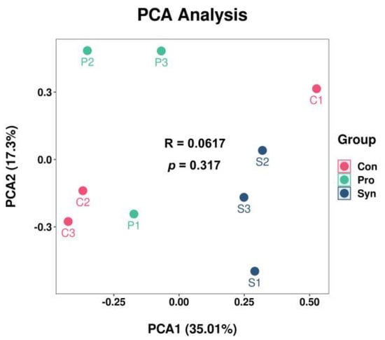The figures presented in this paper were generated using GraphPad Prism (version 9.0.0, GraphPad Software LLC., San Diego, CA, USA). Statistical analysis was performed using SPSS (version 26.0, SPSS Inc., Chicago, IL, USA), and significant differences were determined by analysis of variance (ANOVA) followed by the Tukey test to compare differences among treatment groups. Results are expressed as mean ± standard error, and mean values with different lowercase letters within the same parameter group indicate a significant difference (α = 0.05 level). In the charts, “Con”, “Pro”, and “Syn” represent the control group, probiotic group, and synbiotic group, respectively.