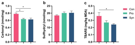 Antioxidant activity of longissimus thoracis muscle and MP in Hu sheep. (a) Carbonyl content in MP; (b) sulfhydryl content in MP; (c) TBARS content in longissimus thoracis muscle tissue (* p < 0.05).