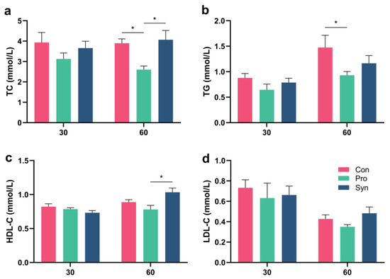 Blood lipid index of Hu sheep. (a) Serum total cholesterol (TC) level; (b) serum triglyceride (TC) levels; (c) serum high-density lipoprotein cholesterol (HDL-C) level; (d) serum low-density lipoprotein cholesterol (LDL-C) level (* p < 0.05).