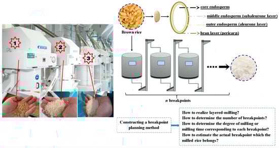 A large part of milling operations involves the use of heterogeneous cereal kernels [1,2,3,4,5,6]. In the milling process, the structure and composition of heterogeneous milled materials can be changed markedly, such as the brown rice (BR) whitening process. Whole BR consists of four main fractions (as shown in Figure 1), namely the bran layer (pericarp layer), outer endosperm, middle endosperm (aleurone layers), and core endosperm [7]. Rice milling is a key procedure to remove the pericarp and aleurone layers from the exterior of the BR kernels, and the amount of these fractions removed is referred to as the degree of milling (DOM). In recent years, extensive research has shown that there are the considerable differences in composition and structural strength of each fraction [8,9], thus layered milling based on the microstructure of BR would be quite beneficial for enhancing the quality of the rice milled and meeting the different needs of consumers. A reasonable multibreak milling system is desirable, which enables cereal kernels to reach layered milling. Therefore, multibreak milling systems (a schematic diagram of the multibreak point milling system is shown in Figure 1) have been widely used in large-scale commercial rice mills in recent years [10,11]. However, at present, control on the DOM range for each single break and planning of the number of breakpoints are based primarily on the experience of operators and their proficiency with the processing machinery in practice [12]. As a result, the existing multibreak milling system is not only often unable to achieve layered milling but also brings huge economic losses to large-scale commercial rice mills. For example, due to excessive breakpoints, excess equipment may be idle, and the final product may be overmilled and contain a high breakage rate. On the contrary, too few breakpoints is also unreasonable because it will cause the multibreak milling system to lose the advantage of layered milling or cause the final product to fail to meet the requirements. In addition, how to control the milling time (MT) of each single-breakpoint mill to meet the requirements of layered milling is also an urgent problem to be solved. Consequently, it is of great practical value to explore the changes of milled rice during the whole milling process, and to establish an objective and highly efficient breakpoint planning method based on this.