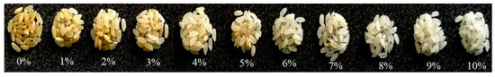 According to the different measuring methods of volume, the bulk density (ρb) was the ratio of the mass (Wb) of the grain to its total volume (Vb), whereas the true density (ρt) was the ratio of the mass (Wt) of the grain to the solid volume (Vt) occupied by the sample. The bulk density was determined by filling an empty 10 mL graduated cylinder with the rice samples, consolidated 3 times to achieve uniformity in the filling process as reported by Irtwange et al. [35], and the weight of the samples was obtained by subtracting the weight of the cylinder from the weight of the cylinder and samples.