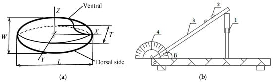 The axial dimensions (Figure 5a), viz., length (L), width (W), and thickness (T), were measured using a digital vernier caliper (111N-102V-10 type, Guanglu, Nanjing, China) with an accuracy of 0.01 mm as principle dimensions. The 100 tested kernels were randomly selected from each DOM respectively. Other parameters of shape and size were then defined from these three linear dimensions.