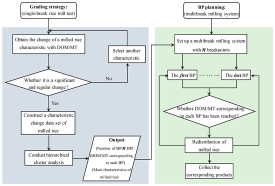 According to Tukey’s Test in Table 1, we can infer that each of the measured physical properties, except true density, aspect ratio, and sphericity, were regularly variable and significantly different (p < 0.05) between different DOMs. Therefore, we try to put forward a breakpoint planning method according to the changes of physical properties of milled rice during the whole rice milling process. The breakpoint planning method presented in this paper is divided into two stages, as illustrated in Figure 6. In the first stage, a continuous single-break rice milling experiment is required to obtain the characteristic changes of the milled rice during the whole milling process and to determine the grading strategy. Basically, this stage will produce the number of breakpoints (n) required the DOM or milling time (MT) corresponding to each breakpoint, and the representative characteristics of milled rice. In the second stage, using the grading strategy obtained in the first stage, a multibreak milling system with n breakpoints is constructed, and the actual breakpoint to which the milled rice obtained from each breakpoint belongs is estimated. Then, the milled rice obtained from each breakpoint is redistributed. Finally, milled rice products that meet different needs are obtained. The following sections describe each stage of the method in greater detail.