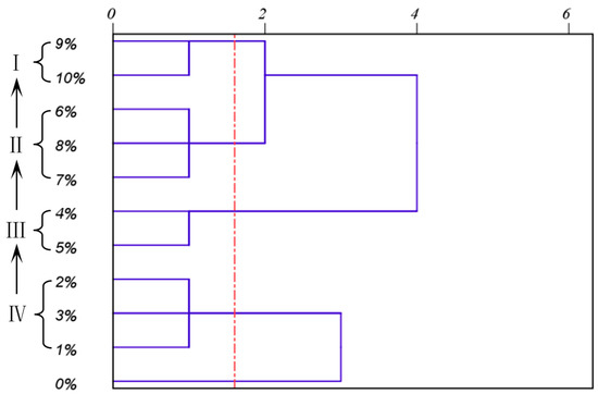 At present, the number of breakpoints of rice multibreak milling systems in rice mills is usually set by the experience of operators. In addition, the number of breakpoints in the rice multibreak milling system also needs to be adjusted according to the varieties of milled rice. However, to date, no objective method exists for planning the number of breakpoints in a reasonable way. Therefore, in order to propose a reasonable breakpoint planning method, it is necessary to grade the whole rice milling process to determine the number of breakpoints in the rice multibreak milling system. As shown in Figure 6, in the first stage, the characteristic changes of milled rice with DOM/MT are first analyzed. It is worth mentioning that, in this study, we mainly recorded and analyzed the characteristic changes of milled rice with DOM rather than MT. However, for the breakpoint planning method proposed in this study, it is also effective to record and analyze the characteristic changes of milled rice with MT. In addition, a further explanation of the changes in the characteristics of milled rice during the whole milling process has been given in Section 3. Therefore, in order to avoid subjective evaluation of the grade of milled rice only according to the characteristic changes of milled rice, we then introduce an objective grading method, that is, HCA.