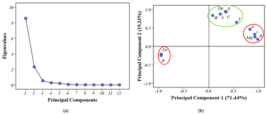 PCA plots. (a) The scree plot of principal components’ eigenvalues; (b) rotated loading plot for different factors on PC1 and PC2.