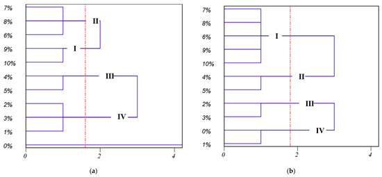 Dendrograms of HCA based on different physical properties. (a) Combination of physical properties including V, S, Dp, B, and Lw; (b) combination of physical properties including B, Lw, ρb, ε, and Mq.