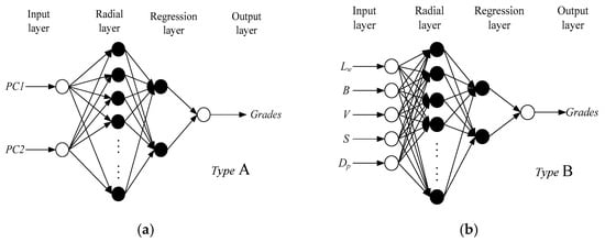 GRNN architectures with different input nodes. (a) Two input nodes: PC1 and PC2; (b) five input nodes: V, S, Dp, B, and Lw.