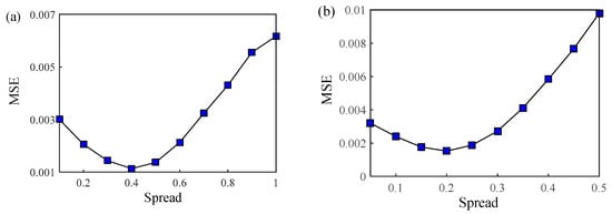 Changed MSE with different spread values of type A and type B in GRNN. (a) Type A: optimal spread is 0.4; (b) type B: optimal spread is 0.2.