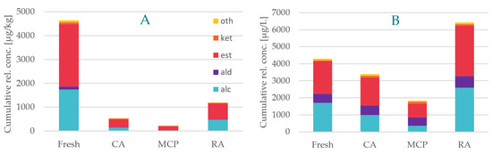 | Compound Name a | RI (exp.) b | RI (lit.) c | Fresh d [µg/kg] | CA d [µg/kg] | MCP d [µg/kg] | RA d [µg/kg] | Fresh d [µg/L] | CA d [µg/L] | MCP d [µg/L] | RA d [µg/L] |
