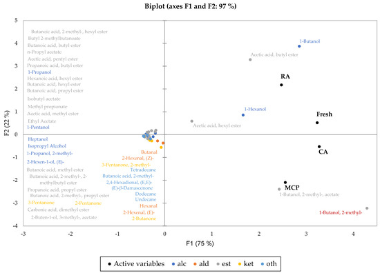 - Fan, X.; Mattheis, J.P. Impact of 1-methylcyclopropene and methyl jasmonate on apple volatile production. J. Agric. Food Chem. 1999, 47, 2847–2853. [Google Scholar] [CrossRef] [PubMed]
