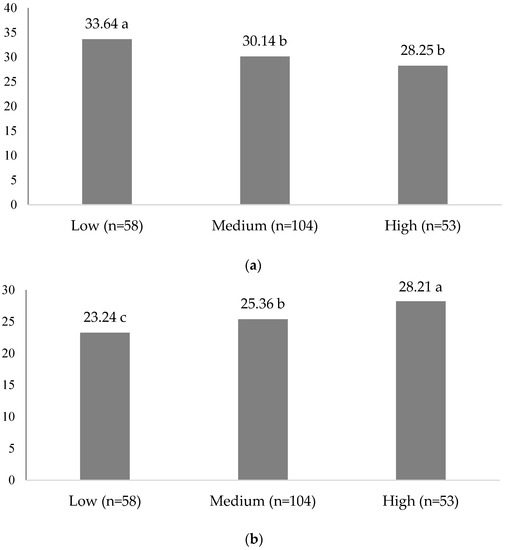 (a) FNS and (b) VARSEEK scores according to FIS status. Low represents the participants with mean fashion involvement score less than 2.6; medium represents the participants who had mean fashion involvement scores between 2.7 and 4.8; high represents the participants who had mean fashion involvement scores over 4.9. Each category represents 25%, 25–75%, and 75% (Q1, Q2, and Q3) quartile values. Alphabetical letters followed by numbers in (a,b), represent significant differences at p < 0.05.