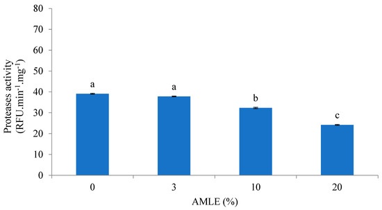 An aliquot of 100 µL of crude protease extract was pipetted into a 96-well microplate. Next, 20 µL of AMLE (0, 3, 10 and 20%, respectively) was added. A total of 80 µL of casein was added to start the reaction. The mixture was incubated at room temperature for 20 min. The absorbance was determined using a SpectraMax iD3 Multi-mode microplate reader (Molecular Devices, USA) with 480 nm excitation wavelength and 516 nm emission wavelength. The result was expressed as protease activity in the unit of relative fluorescence unit (RFU) min−1 mg−1. The experiment was repeated in triplicate. Calculation of protease activity was carried out according to Haydar and Kubra, 2016; Ching et al. 2013 [38,39].