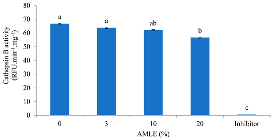 The inhibitory effect of the AMLE was evaluated against cathepsin-B-like activity (Figure 2). The AMLE at a 20% concentration significantly inhibited the cathepsin B activity. Meanwhile, the inhibitor showed significant (p < 0.05) reduced cathepsin B activity compared to other treatments.