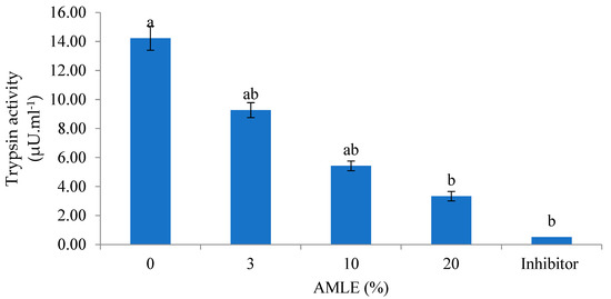 Inhibitory effect of AMLE against the trypsin-like activity from hepatopancreas of M. rosenbergii. Different superscripts (a, b) indicate significant differences (p < 0.05) between treatments (0–20% A.muricata). Standard inhibitor: Tosyl-L-lysyl-chloromethane hydrochloride (TLCK) (20 mM).