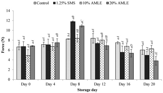 The effects of the AMLE treatments on the firmness of M. rosenbergii are shown in Figure 5. In general, the firmness of the control showed no significant (p > 0.05) changes during 20 days of storage (Figure 5). A similar trend was observed with the samples treated with either SMS or AMLE. The highest firmness was observed in samples treated with SMS and 20% AMLE at 8 days of cold storage. Thereafter, a decrease in firmness was noted for both samples (p < 0.05). The firmness of shrimp coated with 10% AMLE was significantly (p < 0.05) higher on the 8th day of storage, compared to the shrimp coated with 10% AMLE on the 16th day of storage (Figure 5). However, the firmness of M. rosenbergii coated with 20% AMLE was recorded to give the highest value (10.907 ± 0.398 N) on day 8 before decreasing significantly (p < 0.01) to 5.349 ± 1.342 N on the 16th day of storage (Figure 5). A high firmness value is preferable during the prolonged storage time.