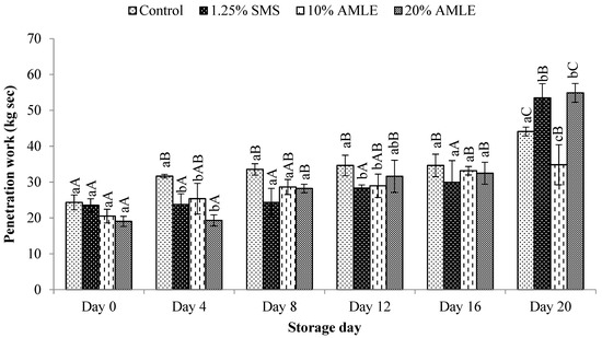 Effect of AMLE treatment at different concentrations on penetration work value of M. rosenbergii during 20 days of cold storage. Small letters (a, b, c) indicate significant differences between treatments in one day (p < 0.05). Capital letters (A, B, C) indicate significant differences between storage days in one treatment (p < 0.05).