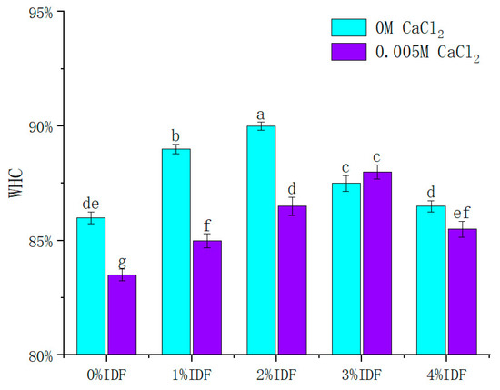 WHC of SPI-WG composite gel at different SIDF and CaCl2 concentrations. Different lowercase letters indicate significant differences between samples (p < 0.05).
