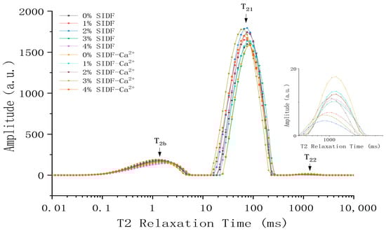 The faster the relaxation time, the more difficult it is for water molecules to move [36]. Three peaks, T2b, T21, and T22, appeared in the T2 relaxation time within 0.01 to 10,000 ms, as shown in Figure 3 T2 relaxation time is related to the mobility of water molecules in the system. T2b represents combined water, that is, bonded with polar groups of large molecules, such as proteins, in the way of hydrogen bonding. T21 represents the water bound in the network structure of the gel, which is the most important water in the gel, and its mobility is related to the interaction of proteins or other components, also known as non-mobile water [37]. T22 represents the water that can move freely in the gel network system, also known as free water.