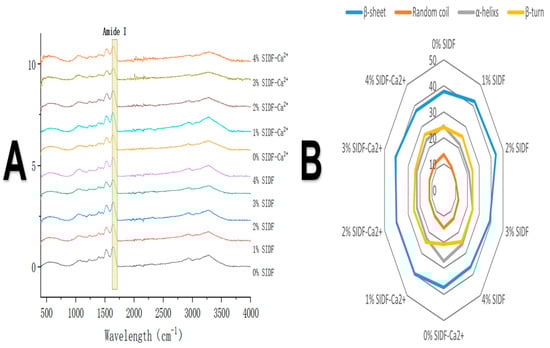 (A) infrared spectra and (B) secondary structure relative content of SPI-WG composite gel at different SIDF and CaCl2 concentrations.