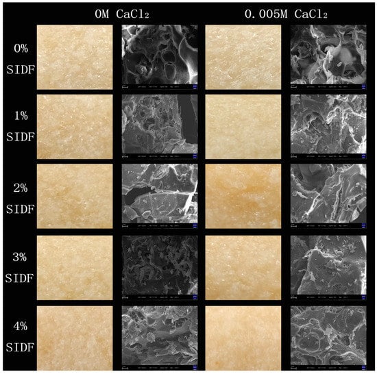 The physical images and microstructures of the gels at different SIDF and CaCl2 concentrations are shown in Figure 5. SPI-WG composite gel had a rough network structure, and the pores in the system were large and uneven. These pores acted as water channels to weaken the integrity of the gel network during the gel-forming process. The addition of SIDF filled the gaps in the gel network at low SIDF concentration (1~2%), increased the gel hardness, and had a higher strength gel network [49]. Zhang et al. [50] also found that the addition of sodium carboxymethyl cellulose promoted the formation of a tight and ordered microstructure, and the dense structure gave the gel good texture properties and WHC. SIDF was excessively dispersed in the gel system at high concentrations of SIDF (3~4%), which increased the distance between protein molecules and hindered cross-linking between protein molecules. It was difficult to form an orderly protein gel network, and the structure was looser and the pores were enlarged. CaCl2 can continuously enhance the cross-linking between proteins by means of salt bridge to improve the gel structure weakening caused by excessive SIDF. However, protein molecules separated by SIDF were aggregated by CaCl2 with further increase in SIDF concentration. Meanwhile, large aggregators formed a gel network structure with a low crosslinking degree, and the gel had weak resistance to external forces [51]. The adjacent large aggregates in the gel slid under the action of external forces and weakened the network structure, thereby showing a low gel strength.