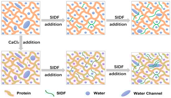 CaCl2 reduces electrostatic repulsion between and within proteins, resulting in more hydrophobic regions being exposed and a reduction in protein–water interactions. The over-aggregation of proteins plays a negative effect on composite gels. The strengthening of protein interaction caused by calcium ion electrostatic shielding can slightly delay the gel failure point when the gel failure critical point of SIDF is reached and promote the filling and addition of more SIDF while maintaining the gel state. However, with further addition of SIDF, the “aggregation power” of calcium ions is not enough to make up for the damage caused by SIDF, and the aggregation of proteins between SIDFs plays a greater role in the destruction of the gel network (Figure 6).