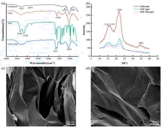 (a) FT−IR spectra of cellulose, CNF gels, AM and CNF−AM gels, (b) X-ray diffraction of cellulose, CNF and CNF−AM gels, SEM image of (c) CNF gels, (d) CNF−AM gels.