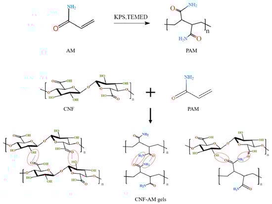 Based on structural characterization and microstructure analysis, it can be concluded that the gelation phenomenon of CNF-AM hydrogels was mainly due to hydrogen bonding, resulting in a double network gel structure. The presumed mechanism for preparing CNF-AM hydrogel is shown in Figure 2. Firstly, AM is transformed into polyacrylamide (PAM) through the action of KPS and TEMED. KPS acts as the initiator of the grafting reaction, while TEMED acts as the cross-linking promoter. The surface of the CNF, prepared by TEMPO oxidation, was rich in carboxyl and hydroxyl groups, which can form hydrogen bonds with carbon and amino groups on PAM. Additionally, CNF and AM can also form hydrogen bonds spontaneously, respectively, and finally form a stable three-dimensional network structure. The CNF-AM hydrogel is a physically cross-linked hydrogel, which is known to have better adsorption than chemically cross-linked hydrogels [52]. Moreover, the high specific surface area of nanocellulose can increase the adsorption of peroxide dyes, and the small molecules (ions) inside the hydrogel can diffuse freely in its three-dimensional network. During the vegetable oil pretreatment process, the mixed emulsion of water and oil is formed by ultrasonic. It is assumed that the rich pore structure and good mechanical properties of the double network hydrogel can be used to detect the freshness of edible oil.