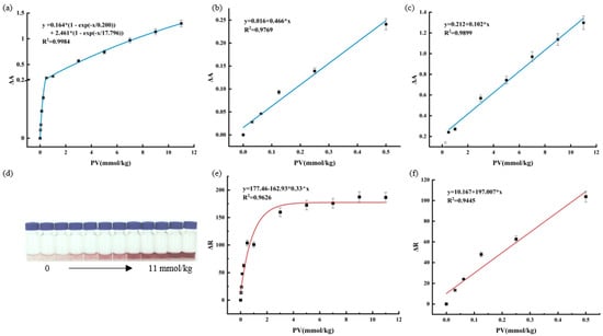 Relationship between the ΔA and H2O2 concentration of functional hydrogels. (a) PV range 0−11 mmol/kg, (b) PV range 0−0.5 mmol/kg, (c) PV range 0.5−11 mmol/kg. Relationship between the ΔR and H2O2 concentration of functional hydrogels. (d) An image of functional hydrogels obtained with a camera, (e) PV range 0−11 mmol/kg, (f) PV range 0−0.5 mmol/kg.