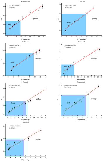 During the accelerated oxidation of edible oils, hydroperoxides are formed through the cleavage of unsaturated fatty acids. As shown in Figure S5, the peroxide values of camellia oil, canola oil, olive oil, peanut oil, corn oil, and soybean oil increased during the oxidation process from 0 to 15 days, while the peroxide values of linseed oil increased during the oxidation process from 0 to 72 h. The results of the iodometric titration method were in close agreement with the ΔA value changes of the functional hydrogel for both monounsaturated and polyunsaturated oils. This was further confirmed by the linear relationship between PV and the ΔA value. Notably, the linear correlation coefficients for all samples were above 0.95 (Figure 4).
