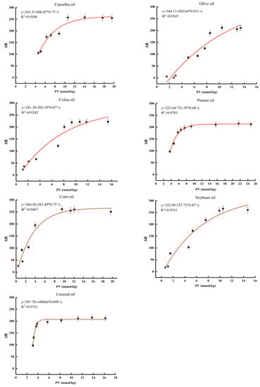 According to the Chinese national standard GB 2716–2018, the PV limit for edible oils is 9.82 mmol/kg. Due to the different fatty acid compositions of various oil samples, the time required for PV to reach the limit value also varies. Obviously, linseed oil is the most susceptible to oxidation, with its PV exceeding the limit value of the national standard after about 25 h of oxidation, rendering the oil inedible. Hence, we calculated the edible limit ΔA values by fitting equations to different oil samples, which can be used to determine the edibility of the oil. The calculated edible limit ΔA values were 2.21, 1.47, 1.39, 1.09, 2.25, 2.02, and 1.49 for camellia oil, olive oil, canola oil, peanut oil, corn oil, soybean oil, and linseed oil, respectively. These results indicate that the functional hydrogel can accurately predict the freshness of edible oils and has broad applicability. The relationship between the ΔR signal and PV is shown in Figure 5, which is similar to the simulated results. Both monounsaturated and polyunsaturated oils follow an exponential function, indicating that the image analysis method can also be applied to analyze the freshness of actual oil samples.