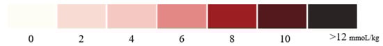 Colorimetry is a technique used to quantify the content of substances based on color shades and is divided into visual colorimetry and photoelectric colorimetry [12]. However, visual colorimetry is less accurate than photoelectric colorimetry because it is difficult to distinguish subtle color differences by observing the target color level with the naked eye [13]. Nowadays, the combination of colorimetric methods, image acquisition tools (such as cell phones, cameras, and scanners), and processing software (such as Adobe Photoshop [14], Image J [15], MATLAB [16], Pantone Studio [17], etc.) provides a new method for simple and accurate colorimetric detection, which can eliminate the subjective error of the observer and further improve the accuracy of visual observation in the field [18]. Digital image colorimetry has the advantages of simple operation, high speed, and low cost and is now used in the fields of medicine, chemistry, and food [19]. To promote standard specifications, color measurement systems are widely used for digital image colorimetry, and commonly used color models include RGB [20], HSV [21], and L*a*b* [22]. At present, digital image colorimetric methods are widely used for food safety testing of milk, fruits and vegetables, meat, etc. [23,24,25,26,27], but there are few reports on the testing of the freshness of edible oil. Additionally, these colorimetric indicators usually reflect the freshness of the food by sensing the change in pH of the system in the form of a film. However, changes in the environmental temperature and humidity during the use of the film-forming indicator may reduce their sensitivity and accuracy [28]. Therefore, to prevent false indications, it is recommended to use hydrogels as colorimetric indicators, as they have high hydrophilicity and can prevent changes in the environmental temperature and humidity [22,29].