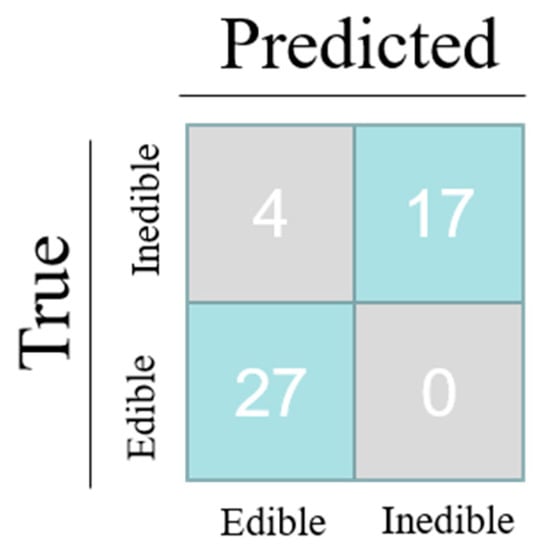 A standard colorimetric card was created based on the color signal obtained from RGB analysis, as shown in Figure 6. To verify the accuracy of the established standard colorimetric cards, a selection of oils, including blending oil, sunflower oil, rice oil, linseed oil, soybean oil, and canola oil, were chosen for experimentation. Figure S6 shows the physical diagram of the peroxide-responsive hydrogel after reacting with different oil samples, while Table S1 displays the corresponding PV of each oil sample. The peroxide content of the oil samples can be visualized by the color difference, with darker colors indicating higher peroxide values. The results of the GB 5006.229-2016 standard test showed that 17 samples had exceeded the national standard limit value and were not recommended for consumption, while 31 samples did not exceed the limit value and were deemed safe for consumption. As shown in the confusion matrix in Figure 7, among the 31 samples that were actually edible, 27 were correctly identified as such, while four were misclassified as inedible. Among the 17 samples that were actually inedible, all were correctly identified as such, resulting in an accuracy rate of 91.67% for the method. It is speculated that the reason for the lower detection accuracy and precision of the colorimetric method compared to the UV-vis method and digital image method is that the color difference between oil samples with peroxide values near the limit value of the national standard is small, leading to misclassification of oil samples near the limit value as sour oil samples based on simple visual judgment.