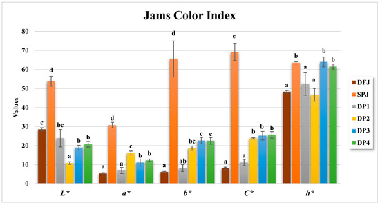 Color parameters for the formulated jams. Data are presented as the mean ± standard deviation (n = 3). Values with different letters indicate a significant difference according to Tukey’s test (p ≤ 0.05).