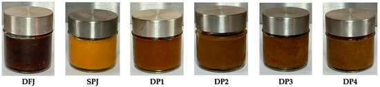 The visual appearance of the formulated jams incorporating SPJ and DFJ at different ratios.